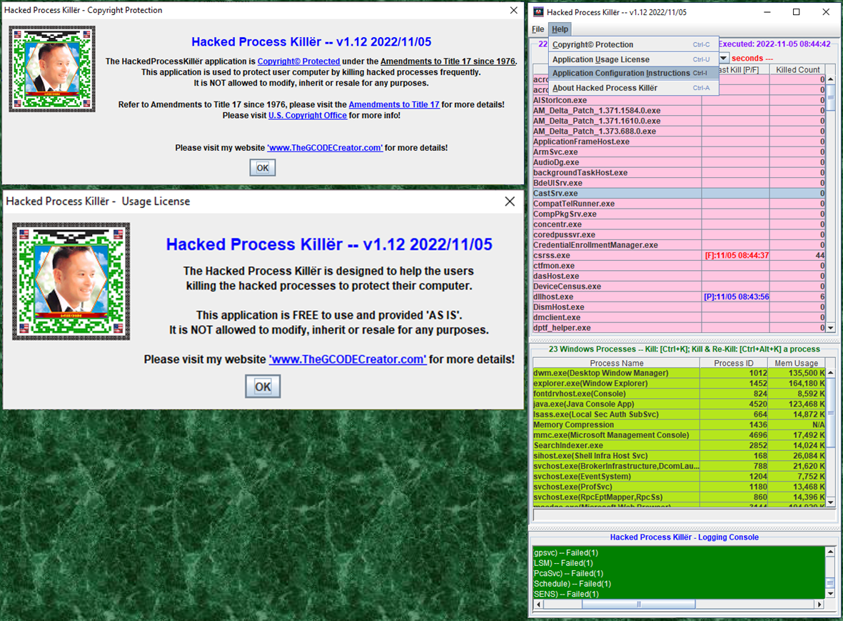 The HackedProcessKiller provides a tool to kill the well known hacked processes that hacking on your computer.