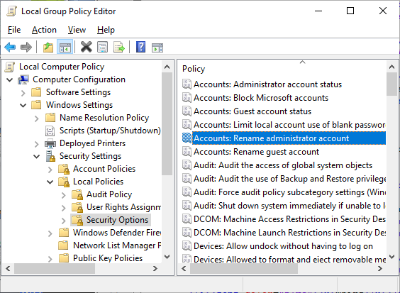 3) Rename 'Administrator' & 'Guest' account names to gabage naming: 'WindowsKey+R' --> Enter 'gpedit.msc'